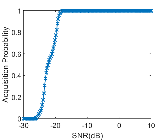 下图展示了在不同信噪比条件下捕获过程中的捕获概率。可以看出,具有合适的信噪比时可以成功捕获5G空口授时信号。随着dB值的降低,捕获概率显著下降。