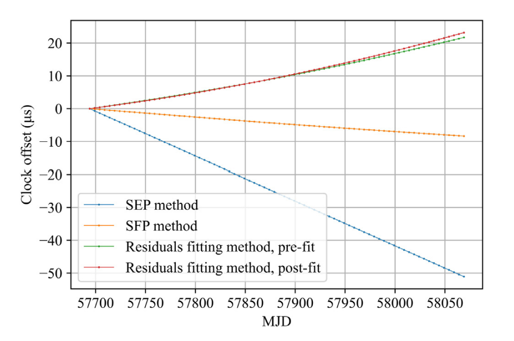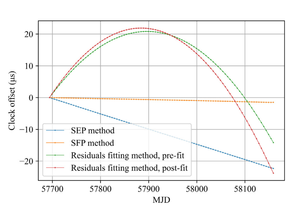 在深空中,航天器的原子钟难以依赖地面进行校准,而X射线脉冲星信号能够随时被观测,携带小型化的X射线脉冲星探测器可以实现在深空中自主校准星载原子钟。该研究利用残差拟合法、轮廓显著性增强(SEP)法和经由SEP法改进的轮廓显著性下降(SFP)法对两台氢钟(BIPM编码1400721,BIPM编码1400735)进行了校准。SFP法的校准结果最优,氢钟1400721经15个月观测数据校准后的钟差低于2微秒(图1),氢钟1400735经12个月观测数据校准后的钟差低于10微秒(图2)。