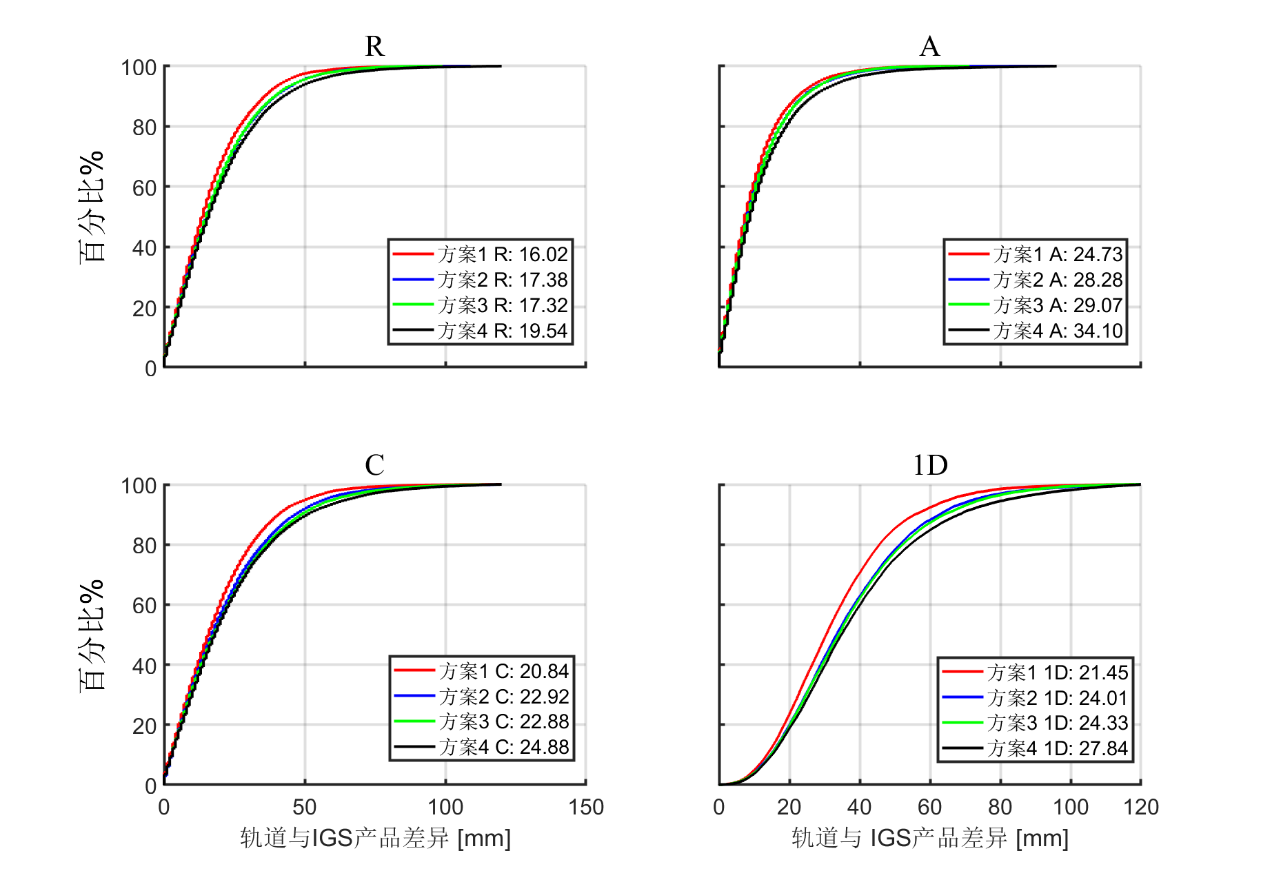 图1 稀疏站条件下,基于4种姿态数据方案联合定轨后GPS的定轨精度