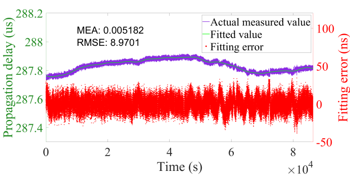 长波信号作为重要的时间频率传递手段,其传播时延易受路径沿线地形、土壤电导率和气象条件等多重复杂因素影响,表现出显著的周期性时变特征。传统预测方法往往仅从单一角度进行预测,难以全面反映时延变化的复杂性。本研究团队通过系统性分析多种影响因素,构建了包含周期项的长波地波传播时延数学模型,通过实际测量数据验证,该模型显示出优异的可靠性和准确性,结果如图1所示。