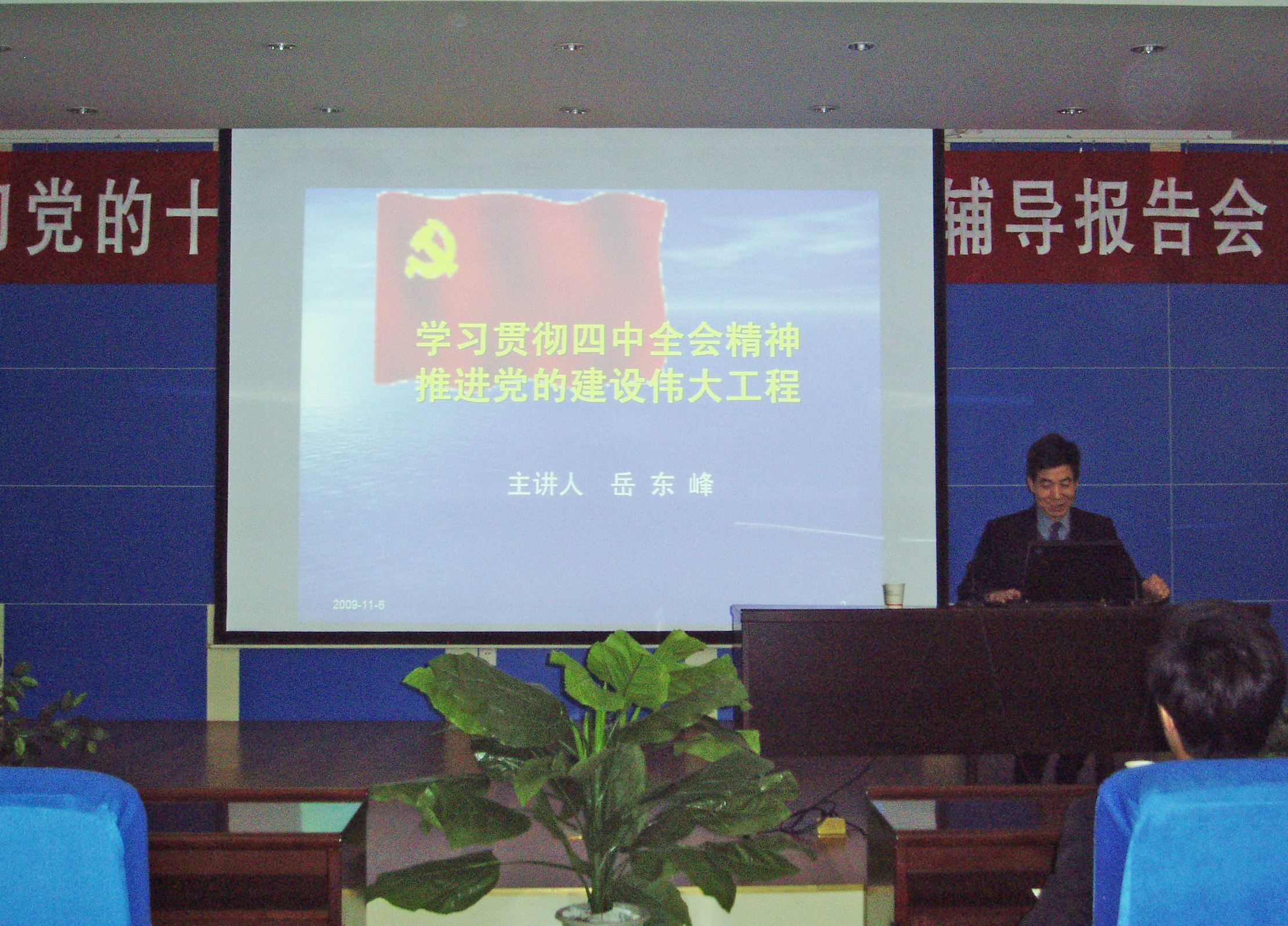 岳东峰教授在题为《学习贯彻四中全会精神,推进党的建设伟大工程》的报告中,首先介绍了党的十七届四中全会召开的历史背景、意义和总体要求,并对《中共中央关于加强和改进新形势下党的建设若干重大问题的决定》(以下简称《决定》)谈了个人体会。他说,党的十七届四中全会是在中国共产党成立88周年、执政60周年、改革开放30周年和迎接挑战危机的国际背景下召开的重要会议,会议审议通过的《决定》是全面贯彻党的十七大精神,对加强和改进新形势下党的建设作出的战略部署,是指导当前和今后一个时期加强和改进党的建设的纲领性文献,具有重大意义。岳教授还结合当前的政治、经济、社会发展实际,进行了重点讲解。