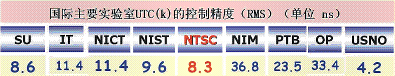 2009年度在全球主要守时实验室UTC(k)的控制精度(RMS)当中,国家授时中心UTC(NTSC)的控制精度处于国际第 2 位,仅次于美国海军天文台(USNO)。