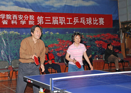 2009年4月28日上午,“中国科学院西安分院和陕西省科学院第三届职工乒乓球赛”在国家授时中心职工活动中心拉开了序幕。此次乒乓球赛由西安分省院工会的组织,国家授时中心工会精心筹办,活动得到了中心领导的大力支持,分省院系统共九个单位近百名运动员和工作人员参加了赛事。西安分省院党组书记周杰同志亲临赛场并致贺词,国家授时中心党委书记王玉林同志代表中心对各单位运动员表示热烈欢迎。