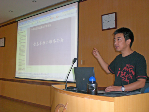 2009年9月3日上午,我中心图书馆在科研楼三楼学术报告厅为学完基础课回中心的2008级研究生和新入所职工举办了一次服务讲座,主题为“图书馆资源与服务”。特别邀请了我中心的国家科学图书馆对口学科馆员——田晓阳老师到会做报告。