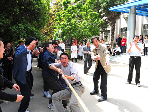 4月30日下午,阳光明媚,春色宜人,为丰富职工文体生活,国家授时中心工会组织职工迎“五一”拔河比赛。活动以党支部为单位,共有八个党支部的128名队员参加。中心主任郭际、党委书记王玉林、副主任吴海涛等中心领导、各研究室主任和科研骨干亦纷纷摩拳擦掌积极参与。