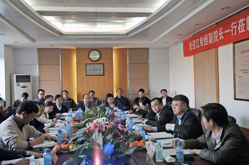 随后,江绵恒一行听取了西安分院院长、国家授时中心主任郭际所做的国家授时中心工作进展和“十二五”及“创新2020”发展规划的汇报。江绵恒副院长对国家授时中心近年来取得的工作成绩给予了充分肯定,并强调:首先,要把授时系统建设好、运行好、发展好,这是我们国家最重要的基础设施之一,不可或缺,一定要完成好国家交给我们的基本任务;第二个方面就是CAPS的进一步发展,它有其创新性,这是CAPS的灵魂。我们要抓住国家重大专项的机遇,积极配合专项,完成好专项的各项任务;第三要加强前瞻性科技布局,踏踏实实去做,五年初有成效,十年必有成效。另外,还要在体制机制上下功夫,加强平台建设,使更多的年轻科技人员能在这里得到更好的发展,国家授时中心的明天一定会更加美好。