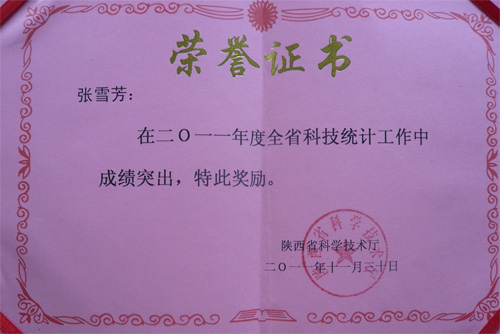 国家授时中心张雪芳荣获2011年度陕西省科技统计工作先进个人