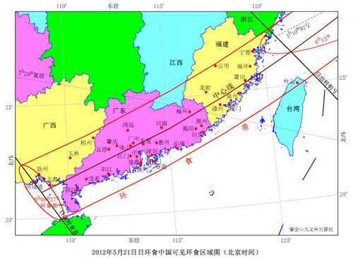 5月21日早晨,我国境内将发生一次“日环食”天象,环食区域西起我国广西北部湾,穿过广东、江西南部、福建大部、台湾北部,进入太平洋,其他我国大部分地区都可见不同程度日偏食。当天早晨,我国大部分区域都会看到太阳带食而出,环食带区域可见到“金指环”美景,环食发生时间在6时06分至6时12分之间,太阳复圆时间在中国大陆地区,最晚在7时30分左右。