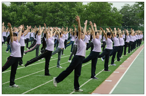 今年是毛泽东发表“发展体育运动,增强人民体质”号召60周年。为进一步贯彻《全民健身条例》,推动全民健身运动的深入开展,6月8日上午,国家授时中心塑胶运动场上,200余名在岗职工共同展示第九套广播操,喜迎中国科学院“全民健身日”的到来。
