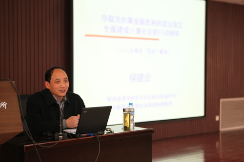 报告会上,陕西省委党校教授侯建会作了题为《夺取党的事业新胜利的政治宣言,全面建设小康社会的政治纲领》的辅导报告。他从对伟大旗帜的新认识、对科学发展观的新定位、对小康改革的新要求、对治国理政的新部署、对党的建设的新谋划五个方面,对十八大报告进行了“亮点”解读。整个报告近3个小时,报告深入浅出,精彩生动。
