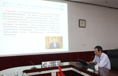中心主任郭际首先传达了《中共中国科学院党组关于学习贯彻习近平总书记在两院院士大会上重要讲话精神的通知》文件精神,并对习近平总书记重要讲话进行了全文传达。郭际在谈到个人学习体会时强调,习近平总书记去年对中科院提出了“四个率先”要求,院党组当前正在实施“四个率先”行动计划,习近平总书记重要讲话从实施创新驱动发展战略和实现中华民族伟大复兴的高度,向全国科技界提出了更高的期望和要求。习近平总书记讲话的一系列重要新思想、新思路对于我们实施“四个率先”行动计划具有重要指导意义。我们要把讲话中提出的一系列新思想、新任务、新要求贯彻到实际工作中去,以更加强烈的使命感和责任感,凝神聚力,奋发进取,为实现“四个率先”做出更大贡献。