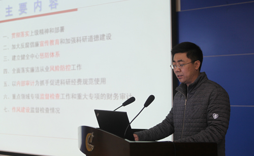 随后,中心纪委书记、副主任窦忠对中心2014年纪委工作进行了总结。2014年中心纪委以建立健全惩治和预防腐败体系为主线,以廉洁从业风险防控和科研经济业务真实性合法性审计为重点,扎实开展工作,有力保障了中心“一三五”科技创新和重大专项等各项工作健康有序发展。2015年中心纪委将根据中央和上级纪检组的要求,按照中心的总体部署,以廉洁从业风险防控和重点领域审计监督为抓手,加强过程监管和精细化管理,努力提高我中心风险防控的能力,提升综合管理的水平,以实际工作成效,为研究所科技创新和“率先行动”计划顺利实施保驾护航。