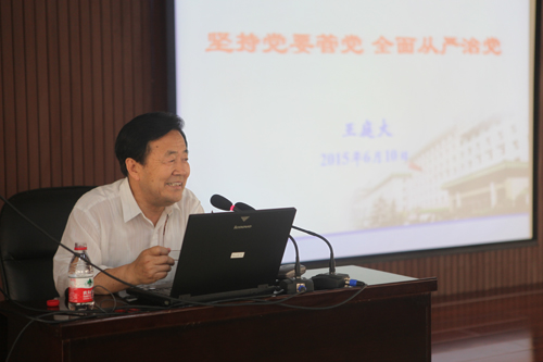 在随后的“三严三实”专题党课上,著名党建专家、中纪委驻中国科学院纪检组原组长王庭大同志主讲了题为《坚持党要管党、全面从严治党》的专题党课。他结合自己党建研究的成果以及长期从事组织和纪检工作总结的典型案例,从全面从严治党的重大意义、全面从严治党的主要内容和全面从严治党的贯彻落实等三个方面,对党中央全面从严治党的战略举措进行了深刻的阐述和详细解读。党课语重心长,精彩生动。