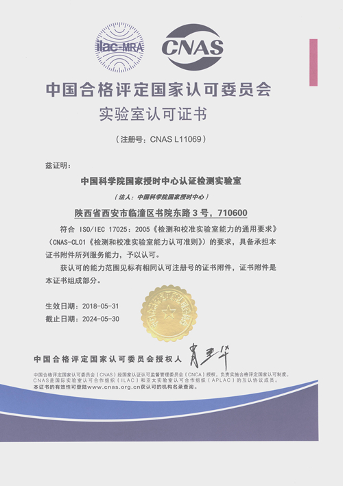 国家授时中心认证检测实验室2016年建立至今,建立了完善的质量管理体系,于2018年3月中旬通过CNAS组织的现场认证审核,并获得CNAS实验室认可证书。根据认可证书,该实验室可向社会提供石英晶体频率标准、铷原子频率标准、铯原子频率标准、GPS定时接收机、北斗/全球卫星导航系统接收设备、GPS接收天线等六个项目的检测服务,并出具国家认可的检测报告。
