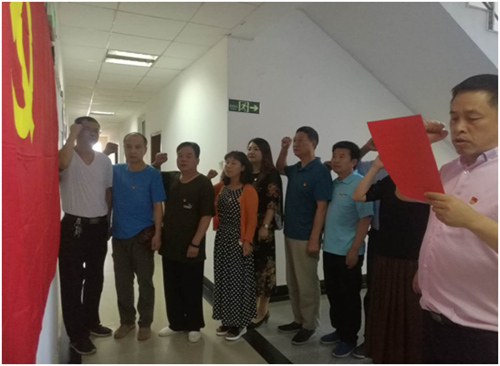 庄严的活动现场,在支部委员李峰同志的领誓下,党员们在党旗下,高举右手,郑重宣誓:“我志愿加入中国共产党,拥护党的纲领,遵守党的章程……”,在场的每个共产党员都在宣誓中,重温入党时的庄严承诺和坚定决心。
