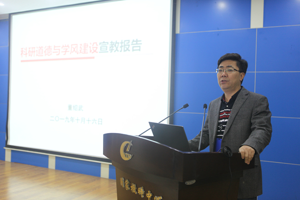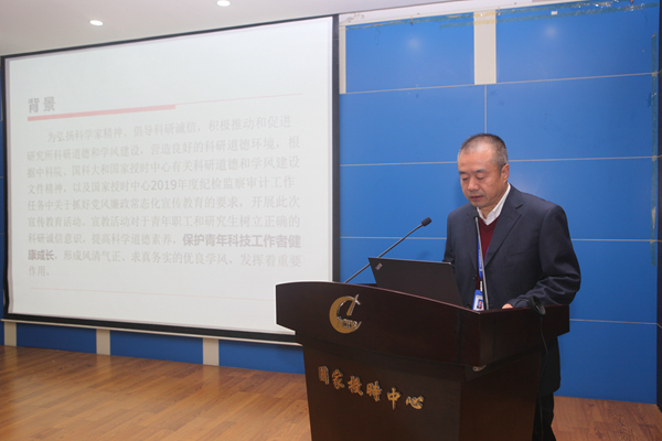 为弘扬科学家精神、倡导科研诚信,积极推动和促进科研道德和学风建设,营造良好的科研学术环境,2019年10月16日上午,中国科学院国家授时中心举办“科研道德与学风建设”主题宣教报告会。报告会由科技处、纪检监察审计室、教育处联合举办,并邀请中心纪委委员、科研道德委员会委员董绍武研究员做专题报告。中心党委书记窦忠与160余位新入职职工、新入所研究生、在职职工参加报告会。报告会由党委办公室主任曹玉玻主持。