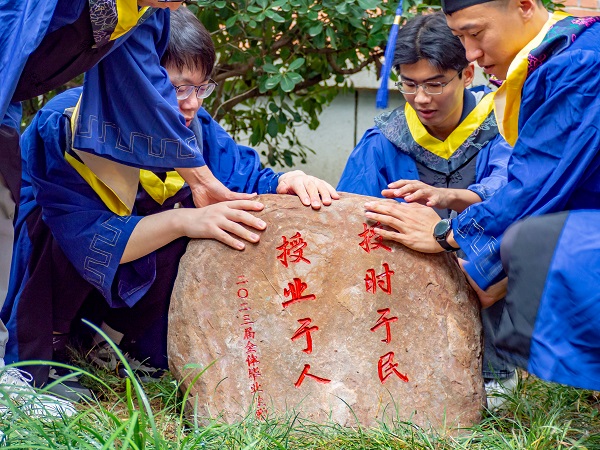 离别之际,2023届毕业生们准备了“授业于人,授时于民”的毕业石送给国家授时中心,中心主任张首刚和学委会主席郭际代表研究所接受了这份纪念品,并与毕业生们一起将毕业石埋下,珍藏了这份祝福和深深的眷恋。
