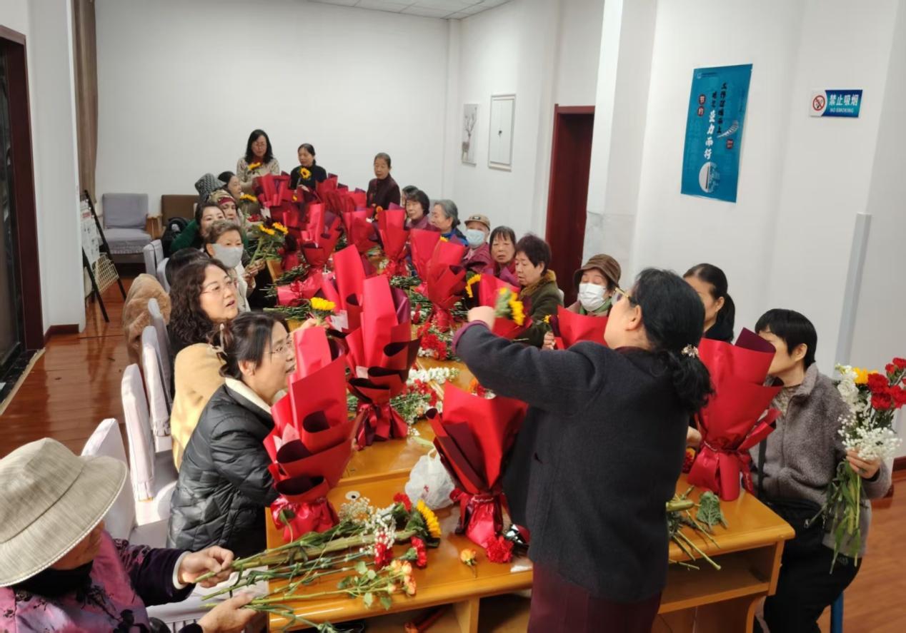 趣味游戏后,花艺小课堂插花体验活动拉开帷幕。专业花艺老师现场讲解示范修剪、插制、固定等基础插花手法,首次体验花艺制作的退休女职工们认真聆听、细心实践,将玫瑰、康乃馨、向日葵等鲜切花材一一修剪,精心布局、巧妙搭配,创作出一件件精美的花艺作品。一时间,花香、笑容、欢声相映成趣,定格下美好温馨的节日瞬间。