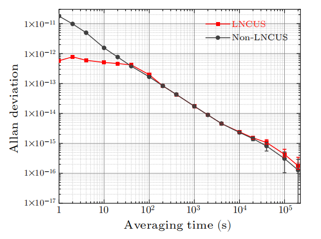 本研究创新性地采用了光纤链路噪声净化系统(Link Noise Clean-up System,LNCUS),有效抑制了光纤链路的噪声干扰;同时,LNCPS中的高稳定性脉冲生成技术保障了系统的短期稳定性,显著提升了光纤时间传递的精度。测试结果表明,系统在时间传递稳定性方面表现优异,时间偏差(TDEV)指标为2.07ps@1s,5.9ps@100,000s;合成不确定度小于49.29ps,具体数据如图2所示。在频率传输方面,10MHz频率信号的传递稳定度为5.7E-13@1s、4.3E-16@10000s,具体数据如图3所示。