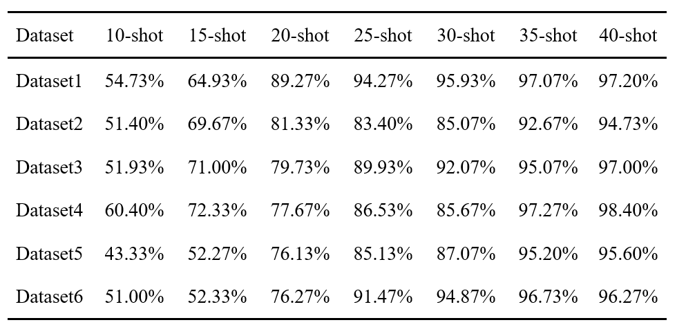 为了验证以上方法的有效性和可靠性,科研人员利用天线采集真实卫星导航信号并构建数据集,开展了多组少样本识别实验(如表1所示)。