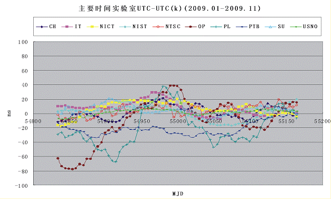 2009年由国家授时中心所保持的地方协调世界时UTC(NTSC)与国际协调世界时UTC的偏差,即|UTC-UTC(NTSC)|<20ns,大大优于国际电联(ITU)要求的|UTC-UTC(k)|<100ns的要求。国际上参加TAI合作的守时实验室增至69个。其中|UTC-UTC(k)|<20ns 的实验室只有7个。