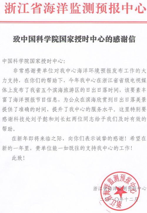 2009年10月,浙江省海洋监测预报中心与国家授时中心开始合作,由国家授时中心免费提供浙江省普陀、嵊泗列岛、象山、洞头列岛、南麂列岛等地的日出日落准确时刻,由浙江省海洋监测预报中心加入海洋预报节目通过电视媒体向公众提供此项公益时间服务。该服务一经提供就受到公众和广大游客的好评。