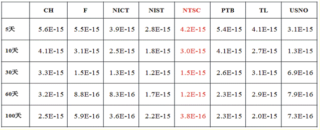 表中:CH-瑞士联邦计量实验室;F-法国国家计量委员会;NICT-日本国家信息与通信技术研究所;NIST-美国计量科学研究院;NTSC-国家授时中心;PTB-德国物理技术研究院;TL-台湾中华电信研究所;USNO-美国海军天文台。