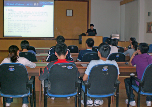 2009年9月3日上午,我中心图书馆在科研楼三楼学术报告厅为学完基础课回中心的2008级研究生和新入所职工举办了一次服务讲座,主题为“图书馆资源与服务”。特别邀请了我中心的国家科学图书馆对口学科馆员——田晓阳老师到会做报告。