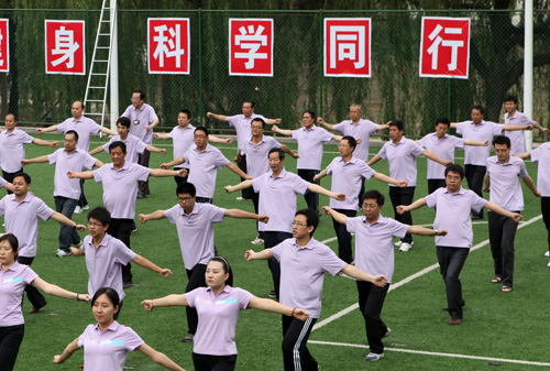 今年是毛泽东发表“发展体育运动,增强人民体质”号召60周年。为进一步贯彻《全民健身条例》,推动全民健身运动的深入开展,6月8日上午,国家授时中心塑胶运动场上,200余名在岗职工共同展示第九套广播操,喜迎中国科学院“全民健身日”的到来。