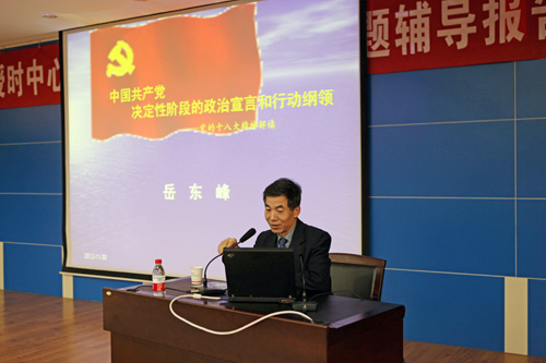 岳东峰在报告中,主要从“深刻理解和把握党的十八大报告的历史地位和主要意义、大会的鲜明主题、过去十年工作总结、科学发展观的新定位和新要求、如何理解坚定不移的走中国特色社会主义道路、全面建成小康社会目标的新要求、全面建成小康社会新的战略部署、全面提高党的建设科学化水平”等八个方面对党的十八大报告精神进行了深入辅导。岳教授的报告重点突出、非常生动。