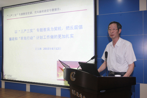 会上,王玉林作了题为“以‘三严三实’专题教育为契机,把反腐倡廉和‘率先行动’计划工作做的更加扎实”的专题党课。他从 “三严三实”内涵和开展专题教育重要意义,“三严三实”专题教育方法与步骤;进一步落实党风廉政主体责任、从严从实做好反腐倡廉工作;以专题教育为契机、扎实做好“率先行动”计划贯彻落实等四个方面,阐述了“三严三实”专题教育的重大意义和丰富内涵,结合白春礼院长专题党课,剖析了中心在科技创新和干部队伍中存在“不严不实”的具体表现和严重危害,针对中心廉政建设中存在问题,就如何进一步落实廉政主体责任提出了工作要求,对中心“三严三实”专题教育工作进行了具体部署。王玉林强调,要将“三严三实”专题教育融合到党的日常工作中,融合到中心“十三·五”科技发展规划的制定中,融合到研究所分类改革中,融合到中心“一三五”科技发展目标的实施中,融合到中心重大科技成果产出中,确保“三严三实”专题教育取得实实在在的实效。