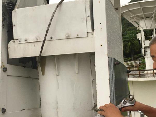 台风到来之前,国家授时中心PVT党员突击队成员南凯、入党积极分子李永军等同志在三亚站积极行动,与西安主站马浪明、黄承强等同志协同工作,按照预案收藏并锁定天线。在台风登陆时,由于风力太大,有一面天线由于锁定故障,被台风吹斜。三亚站李永军同志冒着台风暴雨,用钢绳对天线进行加固,有效保障了设备安全。