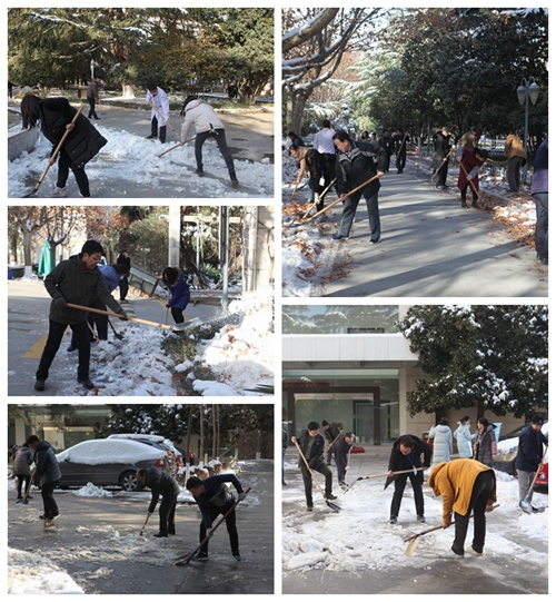 连续4天的降雪,特别是天气转晴后的低温天气,使园区主要路段结冰现象严重,为快速消除安全隐患,早上10点,接到扫雪通知的职工、研究生们,纷纷走出实验室和办公室,统一领取扫雪工具后和中心领导一起分片包干清理园区积雪。大家铲的铲、推的推、扫的扫,齐心协力,配合默契,经过一个多小时,将园区主要路段的积雪和结冰清扫干净。特别是授时部广大职工,更是克服了降雪量大,清扫面积广,路况复杂的困难,与驻授时部武警一同将园区主要路段的积雪和冰晶清理干净。