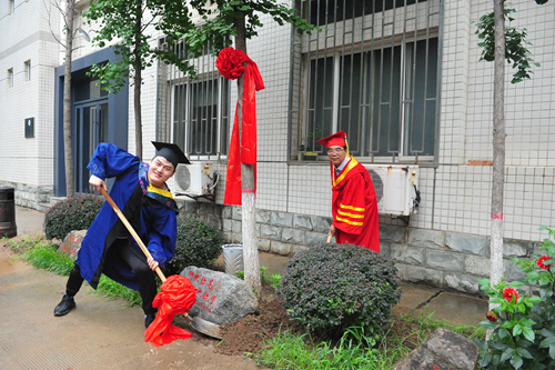 毕业典礼后,2019届全体毕业生与中心领导和研究生导师合影留念,并在综合楼前栽下了毕业纪念树,向中心赠送了刻有“仰之弥高,钻之弥坚”字样的纪念石。