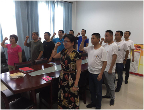 活动现场,全体党员面对着墙上鲜红的党旗,胸前佩戴党员徽章,庄严的举起右手,满怀激情与热血,铿锵有力的念出誓词,短短的12句入党誓词,句句铿锵有力,传达出了身为共产党员的责任感与使命感,展示了长波台党员对党的事业奋斗终身的不变理想和追求。